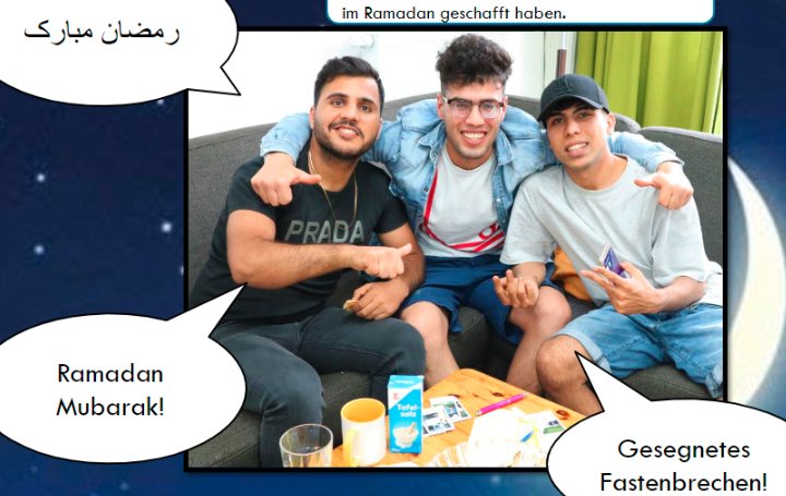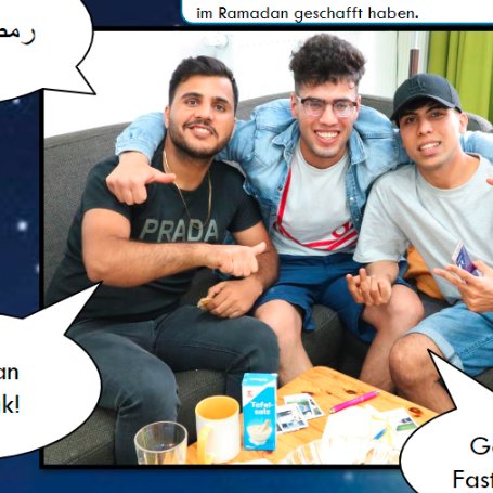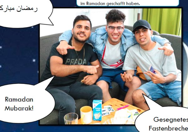 Ramadan trifft auf Corona-Lockdown. In einer Fotogeschichte erzählen die beteiligten Jugendlichen humorvoll und informativ, wie ein Tag im Fastenmonat Ramadan zu Zeiten der Corona-Pandemie aussieht. Um die Story selbstständig ansprechend aufzubereiten, eigneten sie sich im Vorfeld Grundlagen der Fotografie an und setzten sich zudem neben den Veränderungen durch Corona mit der eigenen Lebensrealität und Identität auseinander. Zusätzlich ist eine amüsante "Mundnasenschutzbenutzungsanweisung" entstanden.